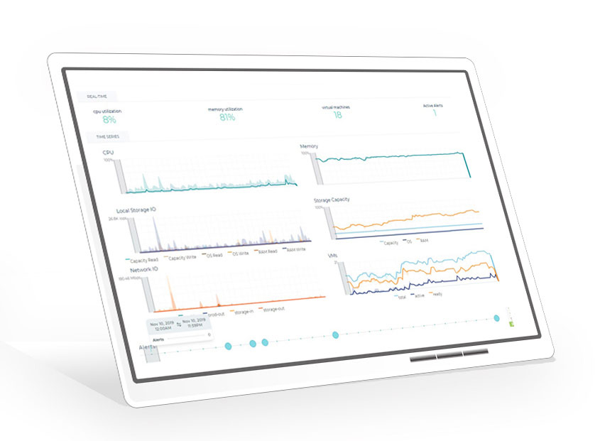 Hive Fabric’s browser-based Remote Administration console uses an HTML 5 Interface featuring an intuitive workflow that provides a 360-degree view of the Fabric Clusters as well as quick access to remote support tools. Admins can navigate between hosts, pools, and virtual machines using a simple point-and-click process. Powered by the message bus, The UI displays data in real-time. The performance Manager View overlays alerts with present and past CPU, memory usage, network and storage IOs. Allowing to go back 30 days, it is a powerful tool to identify the root cause of an issue. The console is packed with great remote support features such as the one-click remedial actions.